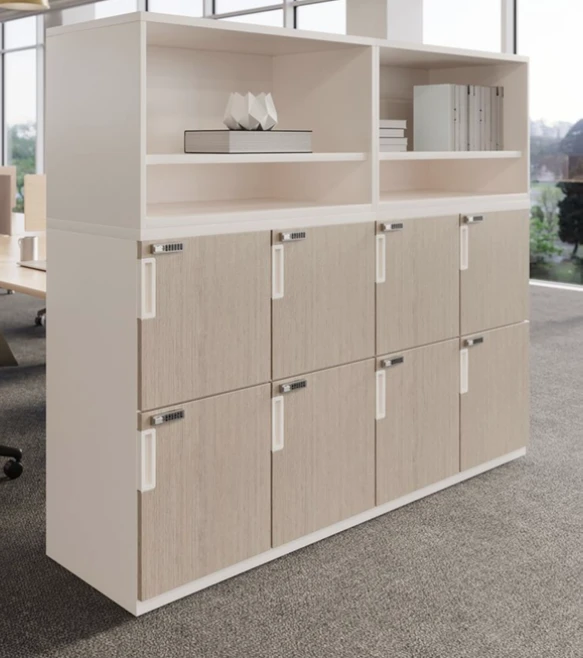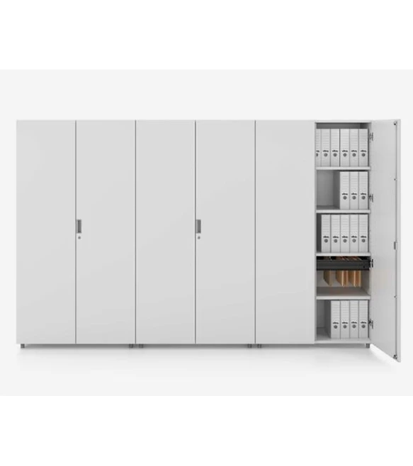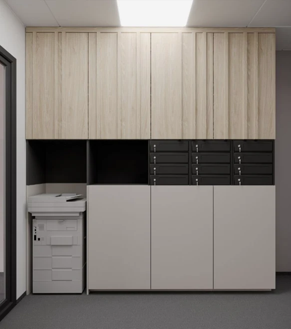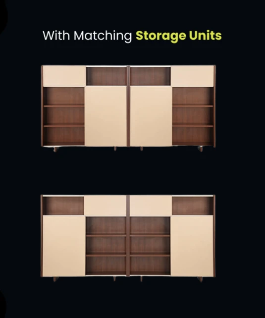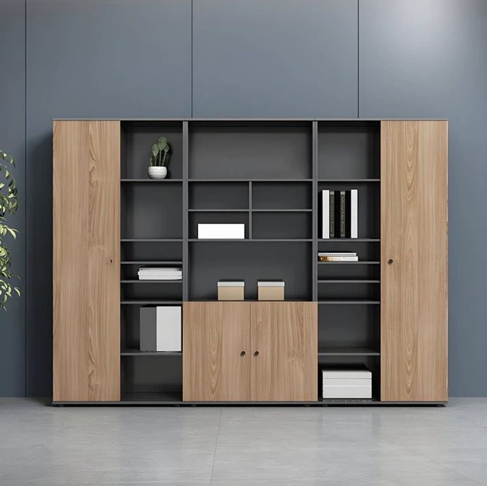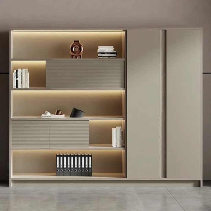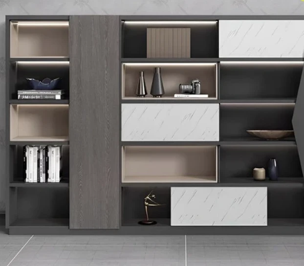 Open or closed shelving systems for books, binders, or display items in executive cabins and meeting areas