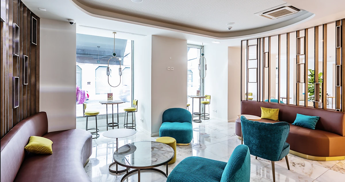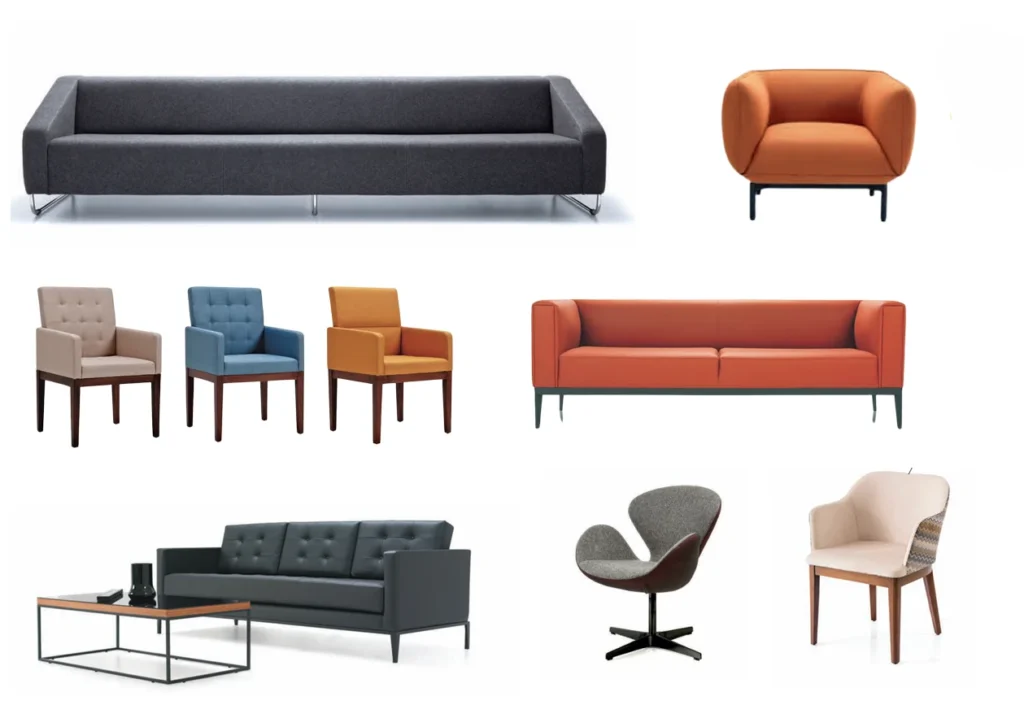 Modular sofas, single seaters, or curved bench seating for a modern welcome zone.